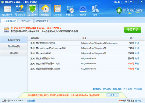 服务器安全狗功能涵盖了服务器系统优化、服务器漏洞补丁修复、服务器程序守护、远程桌面监控、文件目录守护、系统帐号监控、DDOS防火墙、ARP防火墙、安全策略设置以及邮件实时告警等多方面模块,为用户的服务器在运营过程中提供完善的保护,使其免受恶意的攻击、破坏。