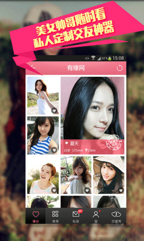 有缘网手机客户端是大型相亲网站有缘网推出的一款手机版应用,通过这款应用你可以用手机登陆有缘网找寻适合你的另一半。想必很多人都听说过有缘网,这个相亲网站成立也很有一段时间了,上面的俊男美女还是挺多的,就是跟其他相亲网站一样发送信件都是要收费的,不过比起找到另一半来说这点费用想必很多人还是愿意付的。