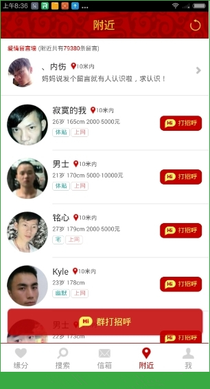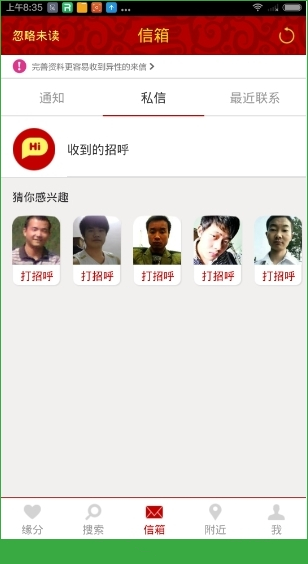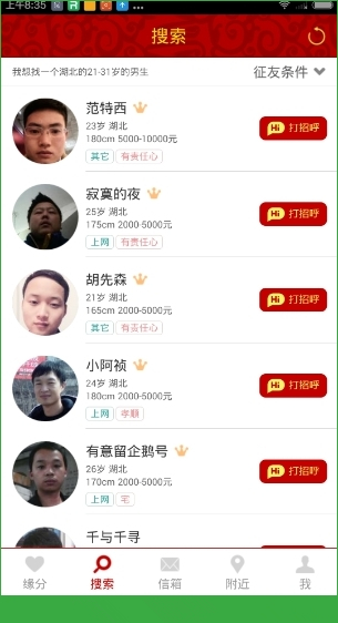 在“搜索”页面中会看到在有缘网用户,点击右边的“打招呼”,即可与他们打招呼;