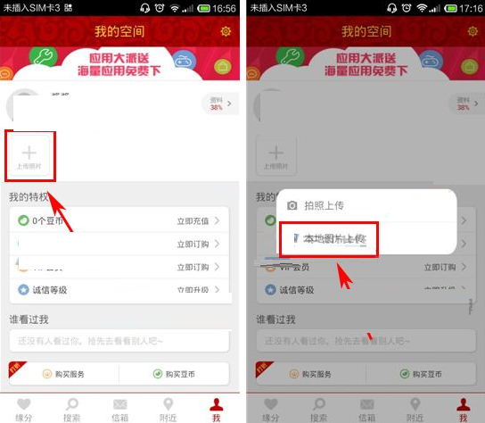 2)跳转到我的空间后,点击【上传照片】的按钮,然后会弹出提示框,选择【本地图片上传】,在相册里选取一张照片点击它即可。