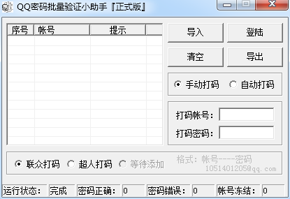 QQ密码批量验证小助手下载是一款qq扫号软件。它的使用方法非常简单,只要输入需要验证的qq号,选择打码方式,点击登入即可查看验证结果,非常方便容易使用。