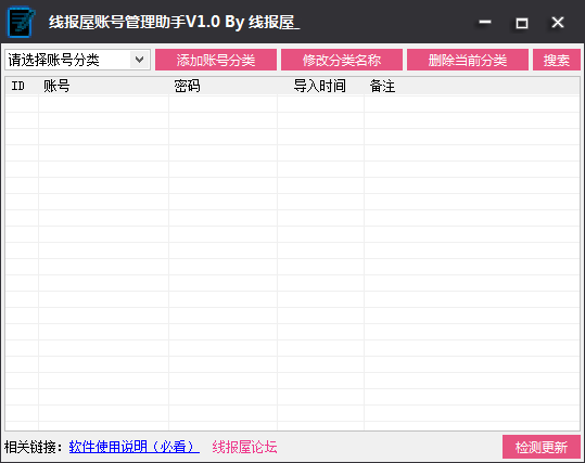 主菜单说明:添加账号分类:添加一个账号分类,例:线报屋账号,点击后输入新的账号分类名称即可,然后右键点击列表框,根据需要选择导入方式