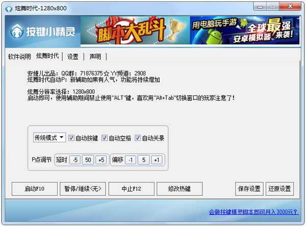 炫舞时代安婕儿是由按键小精灵生成的炫舞时代游戏辅助工具,不属于外挂,无封号风险,QQ炫舞时代这个游戏环境还是不错的,比较按键精灵再牛很难和内存挂抗衡,本来做的是1280x800分辨率和960x600分辨率的,传统连的不错支持8键、连P脚本,欢迎使用!如果这个游戏人气不错我会继续更新功能。【功能介绍】