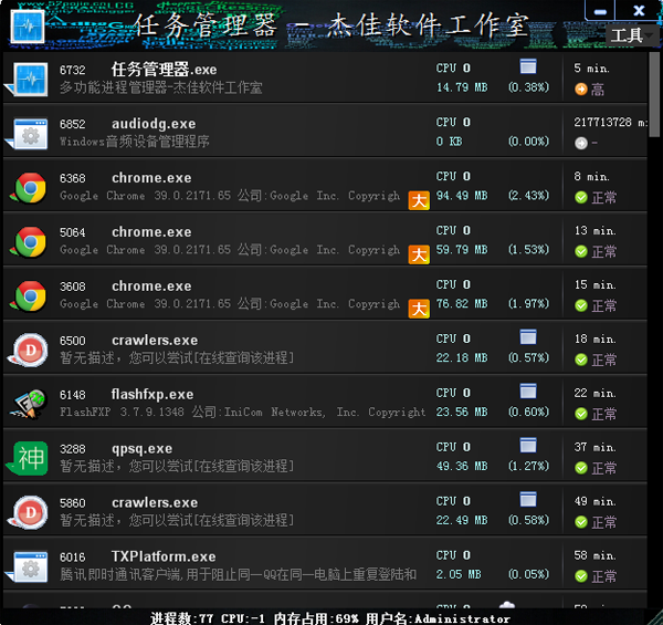 杰佳多功能任务管理器是一款免费的第三方任务进程管理工具,包含了包括进程管理、连接管理、进程防火墙、软件标题自定义等功能,使用方便简单是一款非常不错的第三方任务管理器。【软件特点】