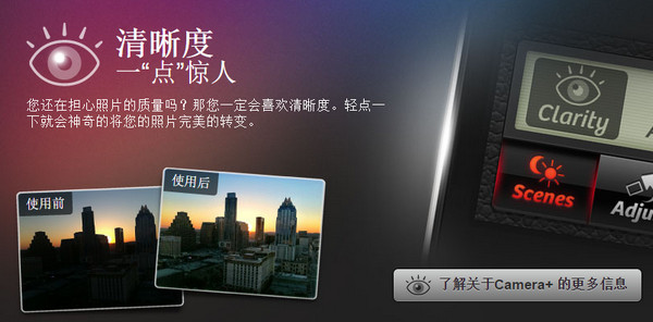 大多数的现代数码相机都有场景模式来帮助您根据具体情况获得最佳的照片效果,为什么您的iPhone不应该有这个超棒的功能呢?Camera+可以让您选择多种场景模式,包括美食,日落,夜景,肖像,海滩及许多。如果您只是轻易的来得到最好的效果,只要点一下自动,就能看到单调的照片一下子变得生动起来了。