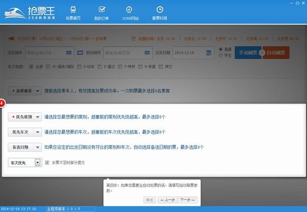 4、接着选择优先搭乘的席别和车次等信息