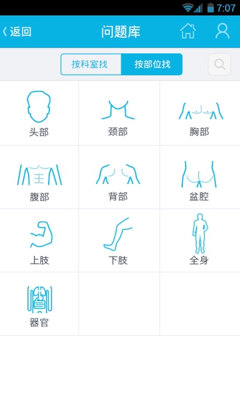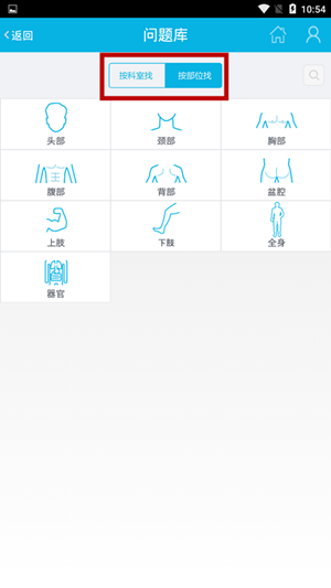 2、点击中间,可以选择“按科室找”和“按部位找”。