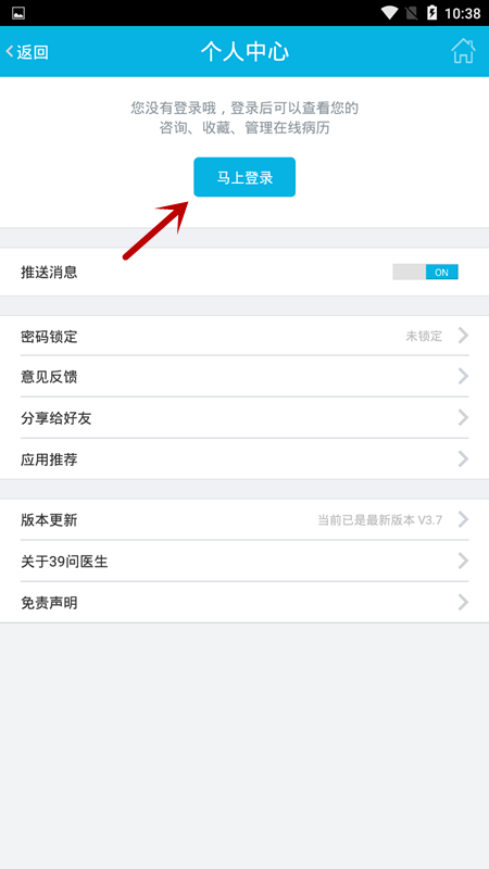 2.个人中心:记录个人信息档案,及39问医生平台发布的各类消息、推送、及管理规定。
