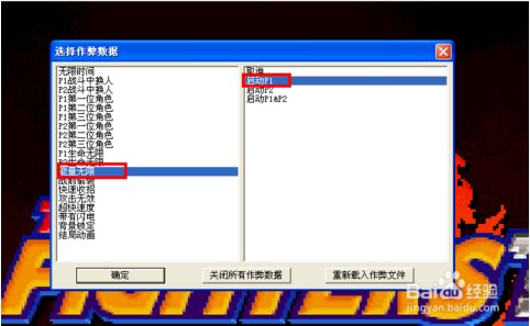 7、当然,“选择作弊数据”的选框中还有其他的选项,诸如“生命无限”、“战前偷袭”、“攻击无效”及选择特殊角色(如暴组、大蛇)等,大家感兴趣的可以都尝试一下。