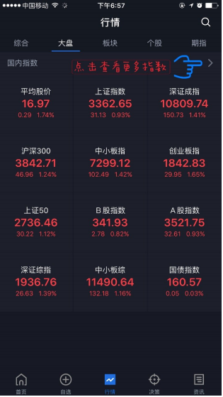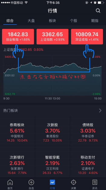 1、指数分时 显示上证指数、深证成指、沪深 300、中小板指、创业板指等指数数据,通过点击左右两边方框做切换显示。
