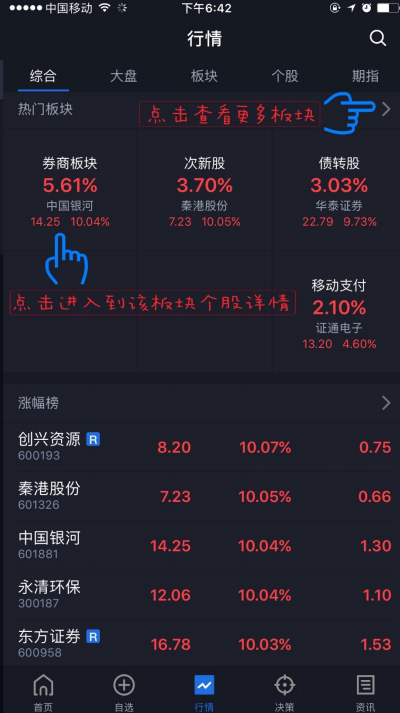 显示当前行情涨幅排名前 6 的板块,以及该板块的领涨个股, 点击板块方框进入该板块列表,点击右上角