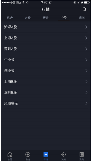 显示沪深 A 股、上海 A 股、深圳 A 股、中小板、创业板、上海 B 股、深圳 B 股、风险警示等行情数据,点击进入 个股列表。