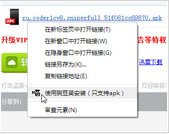如果您需要下载apk并安装到手机上,可以直接在apk的下载链接点击右键,选择【使用豌豆荚下载】即可启动豌豆荚自动下载并安装apk。