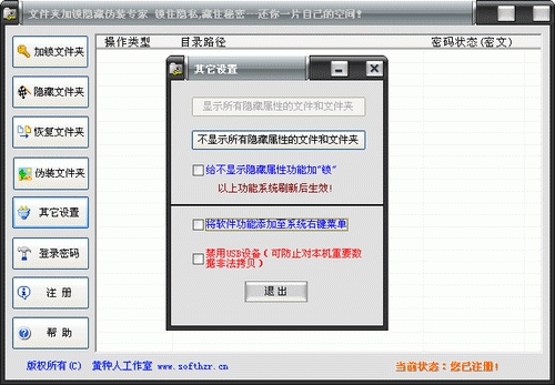 4. 效率快速安全:进行保护的速度特快,无论文件夹大小。即使是几个G的文件夹在瞬间即可被加锁或隐藏。软件采用目前最成熟、优秀的数据保护技术,安全性高。 < 5. 可轻易操作系统内的隐藏文件显示或隐藏。还可给显示隐藏文件功能上把锁,使系统内所有的隐藏文件无法“现身”。 6. 禁止使用USB设置。(可有效防止对本机数据的拷贝.)