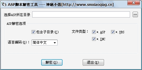 该软件用于对加密的ASP脚本进行解密使用,方便学习研究,支持多种文件类型(.ASP\.VBS\.INC),可以选择文件存放的路径以及是否包含子目录的选择等操作,更是支持多种语言编码的解密,可以根据需要进行选择。包括简体中文、繁体中文、英文、日文、韩文等。