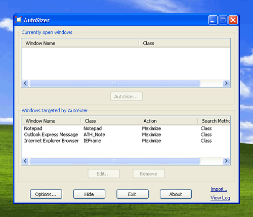 AutoSizer V1.71 汉化绿色免费版 AutoSizer 窗口大小自动调整器是一个功能独特的系统辅助软件.它可以自动调整您指定的任何窗口的大小.例如,某些网络浏览器会在一个非最大化的窗口中打开.使用AutoSizer 窗口大小自动调整器,您可以设置每当打开这些窗口时自动最大化.它对于几乎任何程序都能起作用,包括网络浏览器,记事本,等等.AutoSizer 窗口大小自动调整器驻留运行在系统托盘中(紧靠时钟),因此它不会在工作时挡住您的视线.同时它还提供2种搜索窗口的模式:按照类名和按照窗口标题