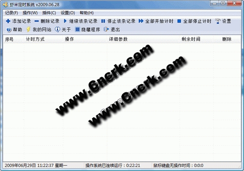虾米定时系统 目前支持五种定时方式: 1、倒计时方式 2、指定日期时间方式 3、鼠标键盘无操作方式 4、开机时间方式 5、循环方式