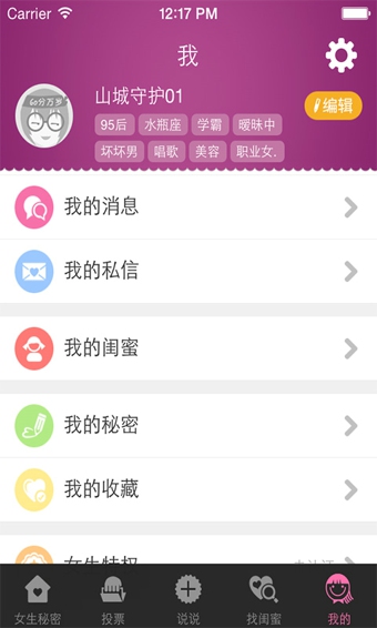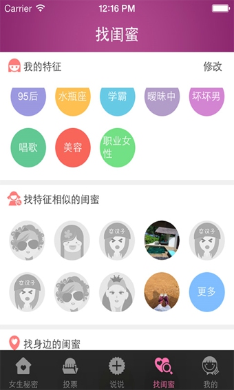 3.新增找闺蜜功能:告诉大家你的特征,我们帮你找到和你特征一样的好闺蜜哦。