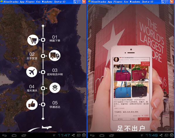 第四步:成功后,打开安卓模拟器BlueStacks,点图标,就可以电脑上运行《海外扫货神器》这款软件啦!