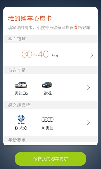 1.购车顾问个性化推荐填写购车心愿卡,你的买车顾问将专门根据你的喜好,每天为你全城搜罗你的梦想好车。