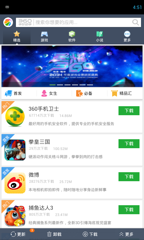 5、发布后不到一天内又放出了一个新的版本,主要改变为取消了切换tab变色和无延迟切换,对于tab无延迟切换个人感觉十分不错,因为安卓最重要的缺点就是硬件永远跟不上软件,安卓手机用到一定的程度就会开始卡,卡这个问题对于用户来说是十分烦恼的,版本改为无延迟切换,用户体验更加好,对于360会感觉有一个“快”的感觉,而不是“卡”。但是取消tab变色,个人感觉又重新回到过去的效果,缺乏新鲜感,对于每一个不同的板块都使用不同的颜色,或许会刺激用户下载。可以建立个性化设置颜色,但是必须要登录个人中心,这样可以增加更多的用户注册
