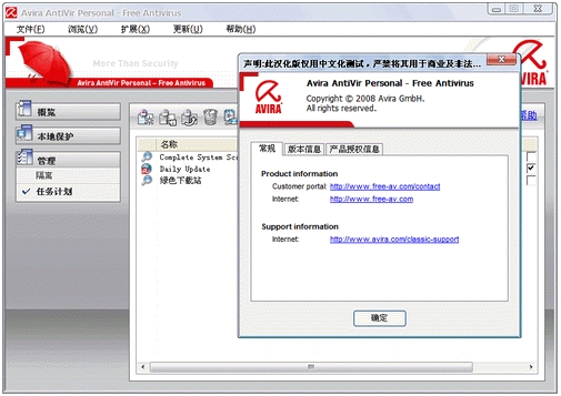Avira AntiVir Personal V8 晓月汉化修正版 AntiVir是Avira公司推出的杀毒软件,功能很全面,杀毒迅速准确,获过很多奖项.Avira Premium Security Suite是Avira推出的面向个人用户的收费版本,该套装包括了AntiVir(防病毒木马)、AntiSpam(反垃圾邮件)、AntiRootkit(Rootkit监控)、Firewall(防火墙)等等模块,该有的功能都有了,体积也算是很小巧.