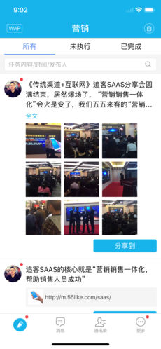 追客app是上海五五来客科技股份有限公司的移动营销产品,是一款致力于“帮助企业实现全员营销”的SAAS工具,通过手机版宣传册、营销任务分发、自营销管理、营销成果管理、营销排行榜等功能模块,集多平台于一体的全网系统。追客app是全球第一款以“让销售无处不在”为指导思想,以“移动营销”为方法,提升销售业绩的工具,通过营销工具辅助、员工营销积极性调动,以及客户拓展方式优化,来帮助企业最终达到提升销售业绩的目的。