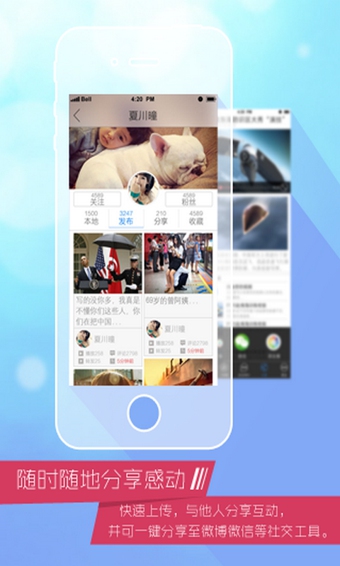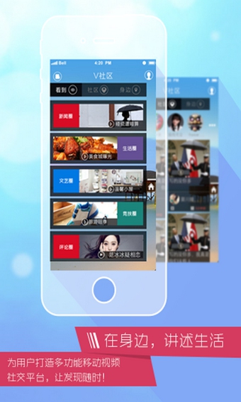用户可随手拍视频,记录身边新鲜事,快速上传。在社区圈子内,第一时间与他人分享互动,获得其他用户的点赞、评论及关注,并可一键分享至微博微信等社交工具。