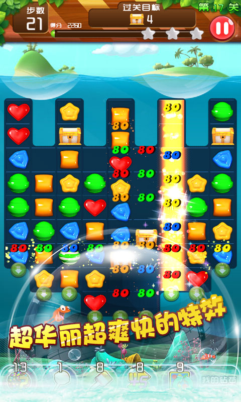 数10种炫目华丽的特效,直线特效、爆炸特效、混合多排消除、全屏爆炸!