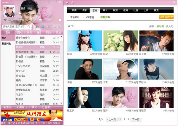 点歌台窗口、列表窗口。点歌台主要有歌曲和图片、视频等素材的搜索和下载功能主窗口是MVBOX操作和使用的主要界面列表窗口保存了当前用户已经下载的歌曲、图片和视频等。