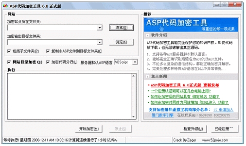 ASP代码加密工具 V6.0 简体中文绿色特别版 ASP代码加密工具全球最好的一款ASP代码加密工具,她能完全保护您的知识产权,即使代码被下载,也无法出真正源码,完美的解析处理,绝对是您加密ASP代码的唯一选择。