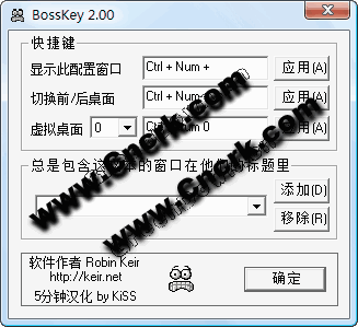 BossKey是一个快捷小工具,顾名思义,是专门对付Boss的。如果你经常玩游戏而又怕老板发现,你就要试试这个了,它可以做到一键隐藏,连续打开10个桌面,真的很好用哦。