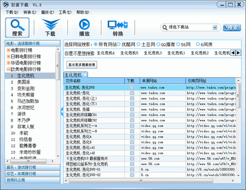 狂雷视频下载软件 V1.8.1 简体中文绿色免费版 狂雷视频下载软件(Raydown)是一款多功能的快速视频下载软件,支持优酷视频下载(www.youku.com) 酷6视频下载(www.ku6.com) 土豆视频下载(www.tudou.com) 六间房视频下载(www.6.cn) 56视频下载(www.56.com) qq博客视频下载(video.qq.com) 等所有的视频网站。