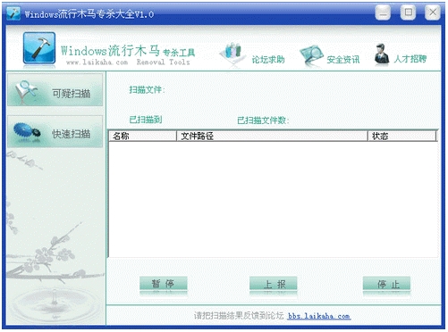 windows流行木马专杀一款查杀近期流行的木马,能有效查杀最新流行的QQ木马、网络游戏木马、盗号木马等,《windows流行木马 专杀》为绿色版,解压后即可使用,无需安装、小而精悍,使用方便。对近期流行的木马能有效的查杀