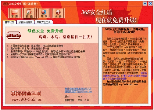 365安全红盾 V1.0 简体中文绿色免费版 国内首款能直接拷贝运行的纯绿色安全工具软件,集合了病毒、木马、恶意插件查杀于一体,机器严重中毒时可用WinPE启动后杀毒,同时具有漏洞扫描、内网不上互联网也能打补丁、垃圾文件及注册表清理、重复文档整理等安全套件。永久免费提供每日病毒库、补丁库升级!