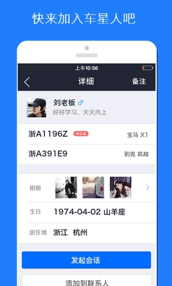 车星人是基于汽车认证的高质量交友应用。不再担心车子停在外面,而怕别人联系不到自己:通过车牌号就可以和附近的车主聊聊人生了!