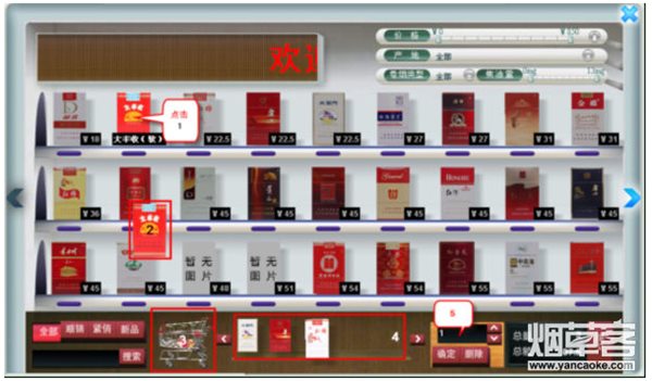 自选订单第一步:选择要订购卷烟,点击商品图片(标注1 ),商品会落入到购物车(标注3)中,同时在标注4显示该商品的小图。