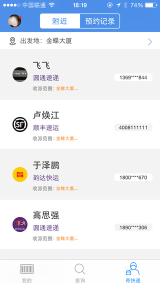 1.查看你附近的快递员的业务信息;2.通过电话预约快递员的方式寄快递;(iPad 与 iPod 设备不支持拨打电话)