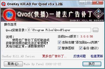 关于美化图标:1.2版提供了美化图标功能,这个功能目前仅针对QvodPlayer.exe的程序图标进行替换。替换的图标其实也是官方内置的,个人比较喜欢。如果你使用了美化图标后,觉得还是官方版本默认的好看。你只需要再次运行这个补丁,同时选中美化图标,再执行补丁程序,即可恢复成官方版本默认的图标,并保留去广告效果。