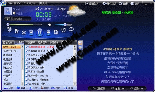 E-MusicBox(E音乐盒) V2.65 正式版 简体中文绿色免费版 E音乐盒是一款融合多款强大MP3搜索引擎、视频搜索引擎、歌词搜索引擎的音乐盒,可以看MTV的音乐盒,只需关键词就可以播放歌曲、专辑、歌手音乐全集、关键词相关所有歌曲的音乐盒
