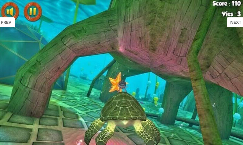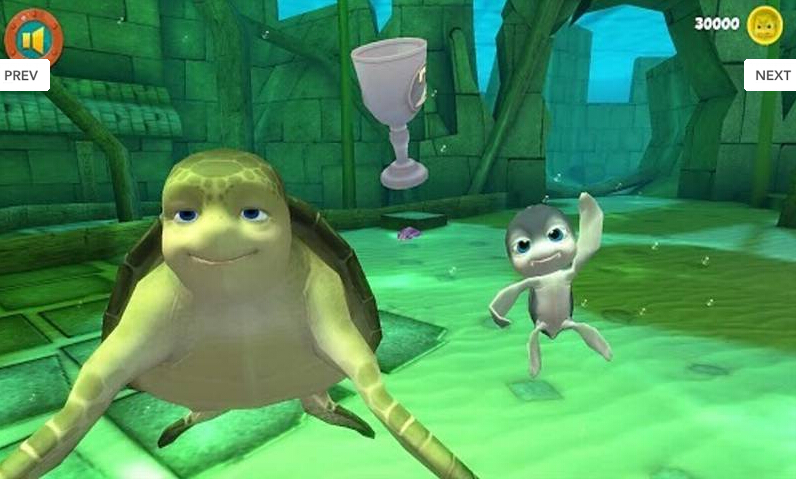 游戏中,玩家将扮演母海龟拯救小海龟的脚色。但玩家们必须注意不可以碰到章鱼的触角喔~~如果碰到章鱼的触角就会变成串烧小海龟啦!