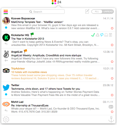 3、从MailBar的状态栏菜单中,您可以轻松地查看所有现有的邮件或只显示未读邮件过滤列表。