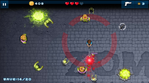《僵尸决战 Zombie Showdown》是一款简单且多样性的僵尸射击类游戏。游戏操作很简单,你只需要点击屏幕的位置就能控制你的战士去到什么地方。一旦有僵尸进入你的射程,战士便会自动开枪射杀它们!看看你在和亡灵部落的战争中能坚持多长时间吧~你还能升级你的武器和护甲以更好的加入战斗。