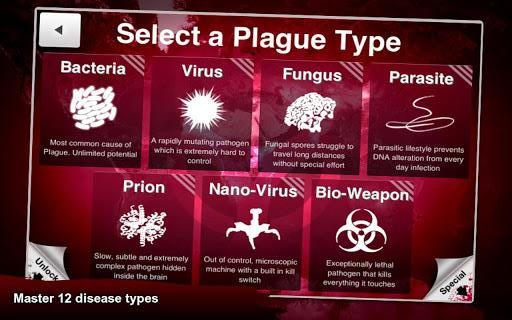 初始设定下游戏只提供一个基本病原体细菌,游玩模式分别拥有简单(Casual)、普通(Normal)和困难(Brutal)三种情况。在不以购买解锁的条件下,玩家每成功完成一局游戏即可解锁一个基因序列,在标准难度以上的条件下胜利一局不同病原体的游戏即可解锁下一个基础病原体。当玩家以困难模式完成所有基础病原体后,便可以解锁具有作弊性质的免疫型瘟疫、隐蔽型瘟疫和无限型瘟疫,但进化版与普通版不同是特殊病原体 Neurax 蠕虫和Necroa 僵尸病毒不需要玩家以困难模式成功完成一局 Neurax 蠕虫,而是且基因序列发现度达到83%以上之后才能够得以解锁。
