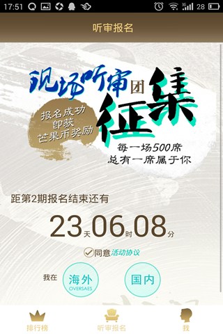 为了帮助观众们实现“去现场”的愿望,《我是歌手》在国内最大的应用市场——360手机助手上首发了官方报名客户端。据悉,这款APP是湖南卫视唯一授权的《我是歌手》官方APP,用户可以通过APP直接报名参与现场听审团。除了有可能成为500个现场观众之外,用户还可以通过APP对每一期的竞演歌手进行投票,亲自为支持的选手加油!