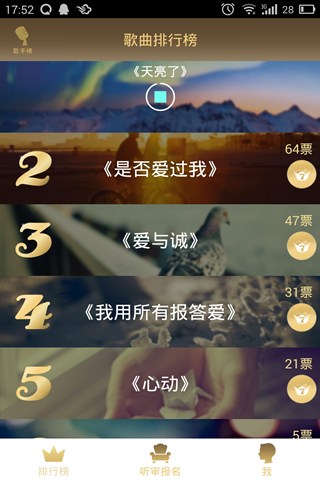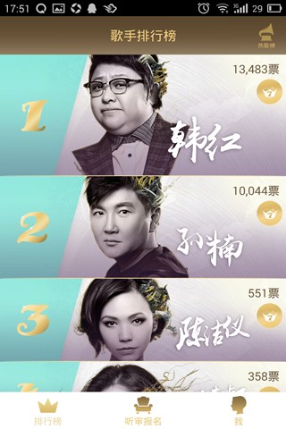 我是歌手官方应用下载是一款我是歌手官方唯一授权的应用软件。该软件可以让用户同时享受和现场观众同等权利,还可以直接报名参与现场听审团,有可能下一个听审团中就有你的身影。