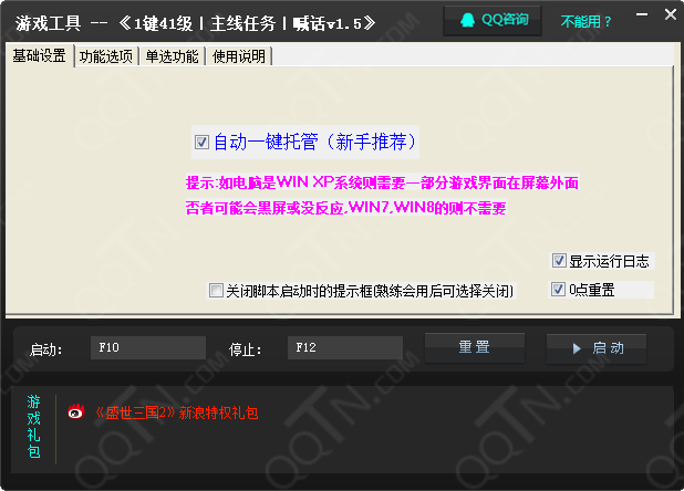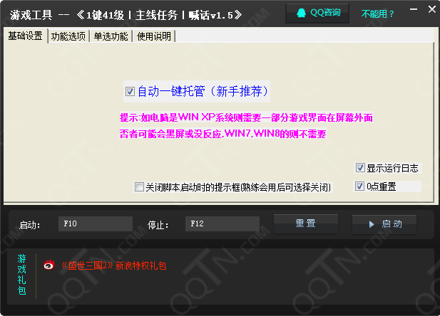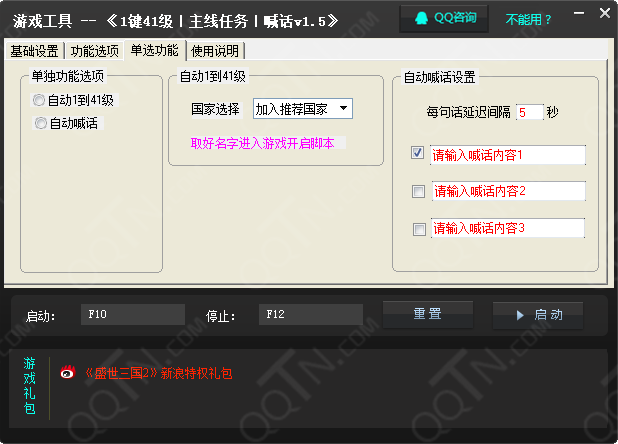 4.在盛世三国2辅助工具中“启动”“盛世三国21键41级|主线任务|喊话v1.5”