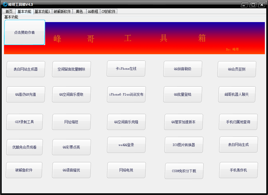 表白网站生成器、空间留言批量删除、卡iPhone在线、qq拼音刷级、QQ会员签到、QQ高仿QB充值、QQ空间音乐提取、iPhone6 Plus说说发布 QQ批量登录 峰哥机器人聊天qq头像获取、QQ强制聊天、lol战绩查询、qq照片墙制作