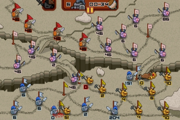 《权利的抽风 Twitchy Thrones》是一款像素风的策略游戏,较为简单复古的画面反而更增添了史诗感,战斗会以即时战斗的形式进行操作,敌我双方甚至三方的军队会在一个小小的棋盘中进行战斗,棋盘中的路线犬牙交错,玩家需要拖动我方的士兵侵入地方的据点与敌军进行交战,将之消灭后就可以将该剧点占领,而每一个所占领的据点会每十秒生存两名士兵。