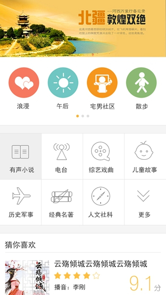 遨播听书拥有都市言情、玄幻奇幻、穿越科幻、武侠修仙、耽美校园、军事历史、总裁同人、灵异推理、鬼吹灯、盗墓笔记、张震讲鬼故事等热门网络小说有声资源。